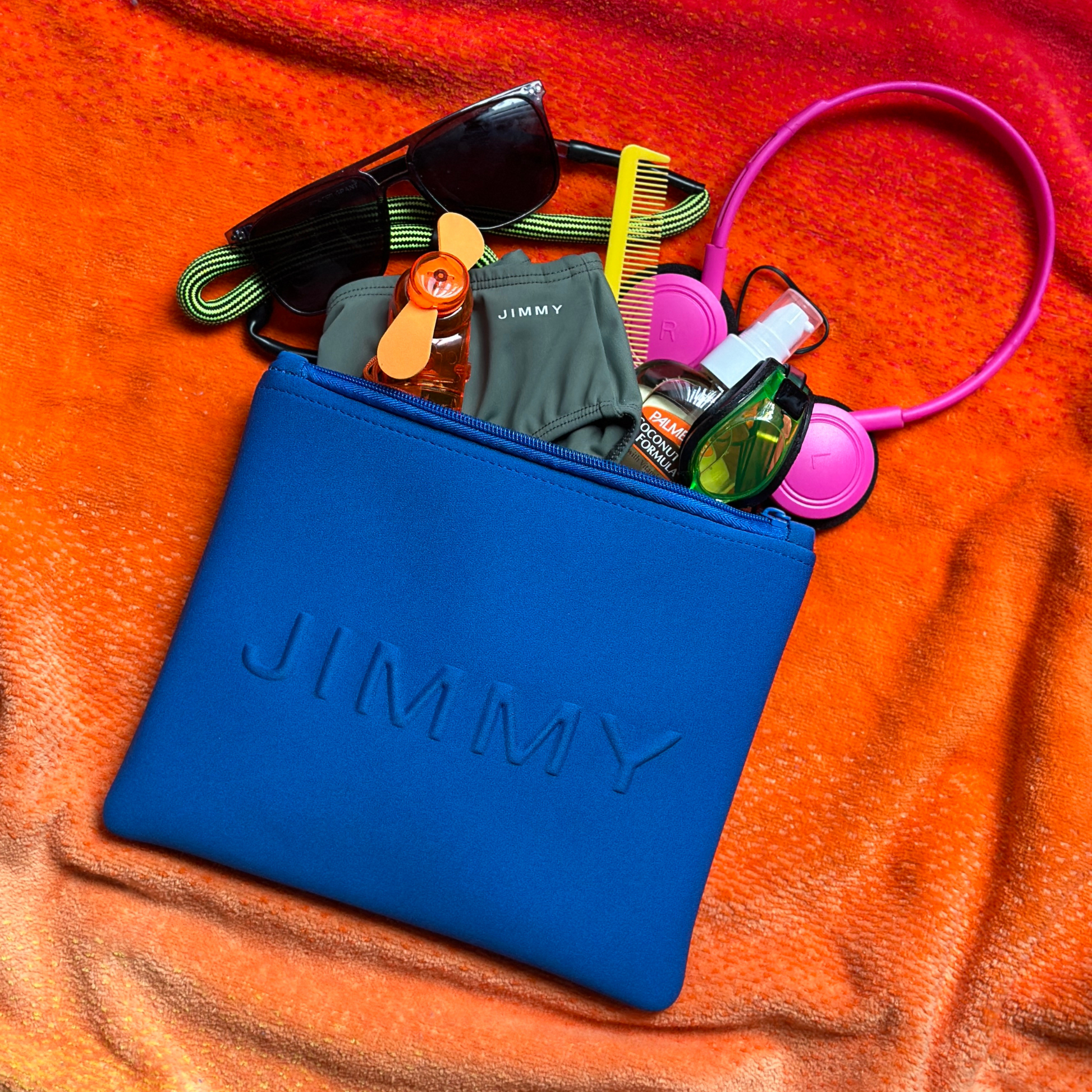 The perfect pouch for when you're pool-side, beach-side, or on the go. Stamped with a subtle/not-so-subtle logo, this pouch is made of neoprene, which is resistant to sun, water, and chemicals. Pack your JIMMY swim brief along with you sunscreen, sunglasses, and any other pool-side necessities and secure it with the top-zip zipper.