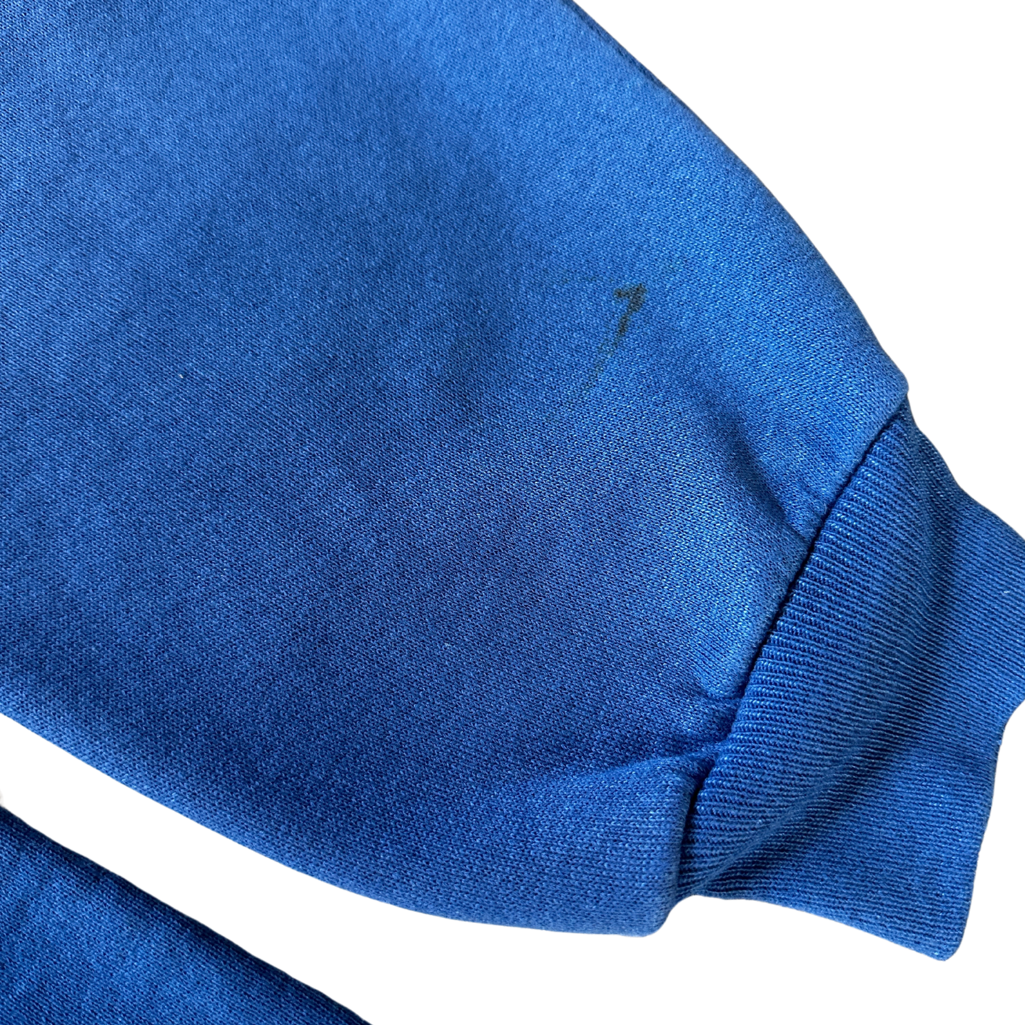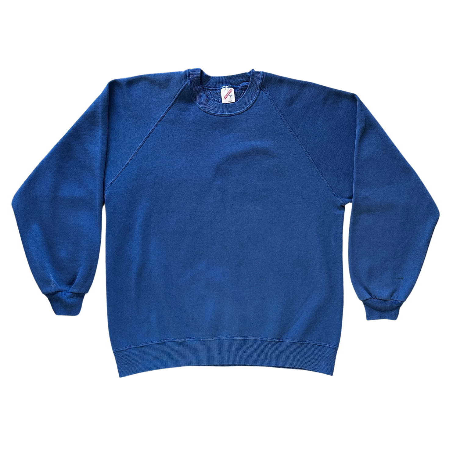 Made in the USA, 80s/90s, raglan sleeve sweatshirt royal blue. Mixed fabric (50% cotton / 50% polyester). Very good condition, small marks throughout. Size XL on tag, refer to size chart and measurements below: